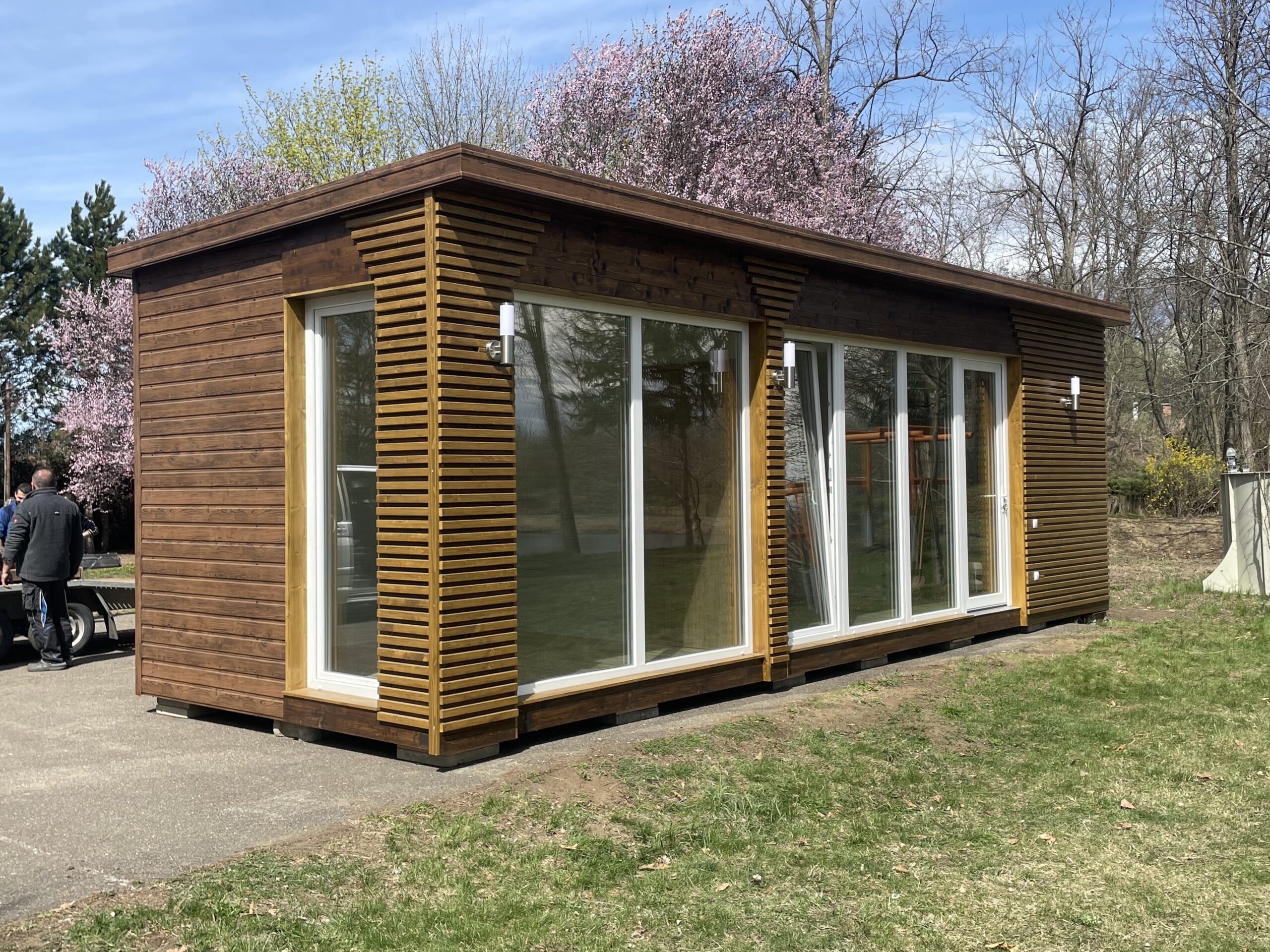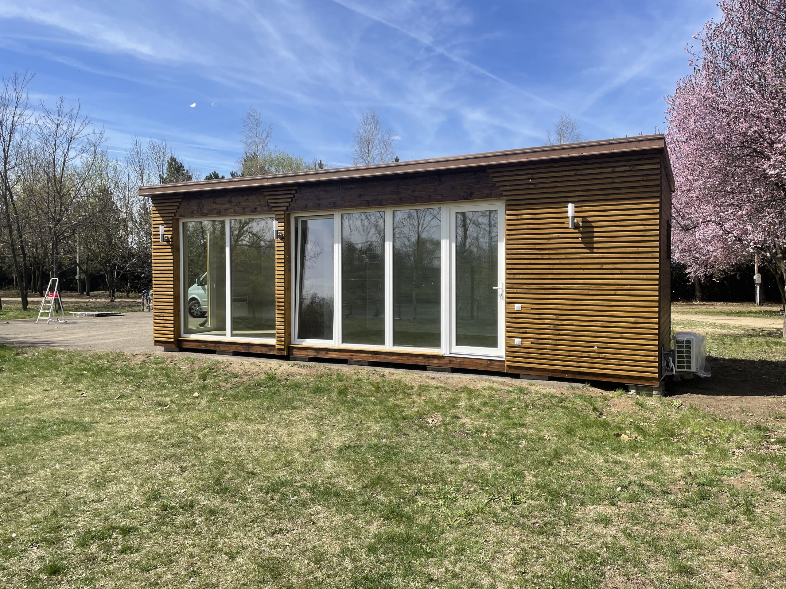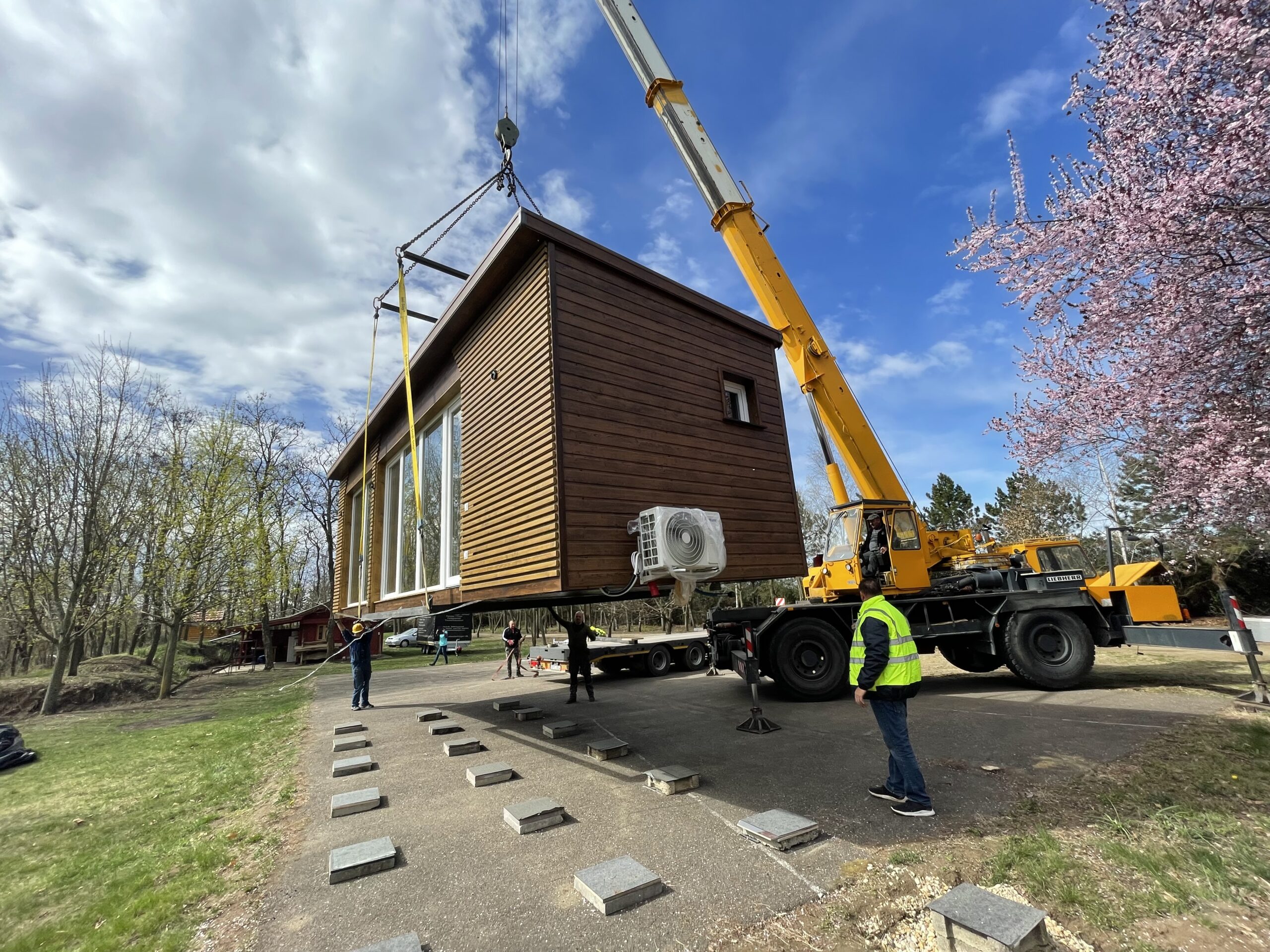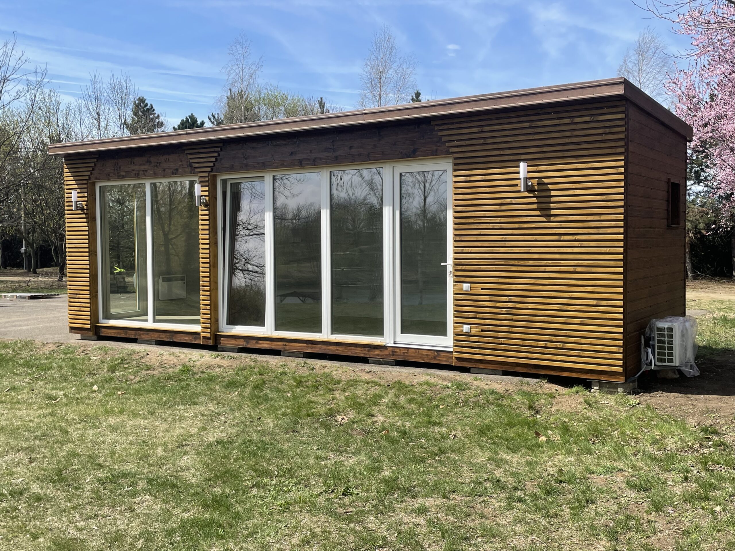 - Zöld övezetben, közvetlen a természetben elhelyezett moduláris házunk a megrendelői igények szerint került kialakításra, ahol az elvárás az volt, hogy a homlokzat burkolatával megfelelő harmóniát alakítsunk ki a környezettel úgy, hogy az épületbe minél több természetes fény juthasson be.